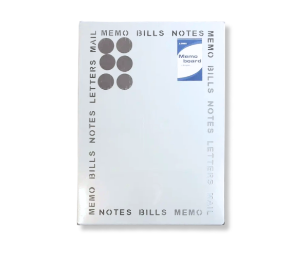 Metallist teadetetahvel mõõtudega 450 x 325 x 25 mm on stiilne ja praktiline lahendus nii kontorisse, koju kui ka HoReCa-sektori ettevõtetele. Komplekti kuulub kuus ümmargust magnetit (läbimõõt 35 mm) ning kruvid ja tüüblid, millega tahvli saab mugavalt seinale kinnitada. Tahvli äärtes on perforeeritult sõnad „Memo, Bills, Notes“, mis annavad sellele modernse ja õhulise välimuse.