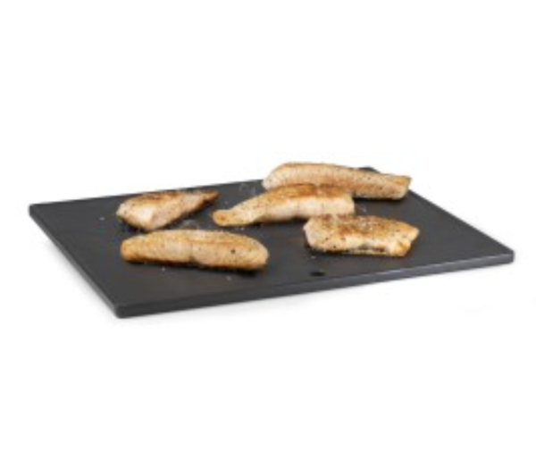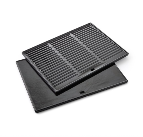 Emaileeritud malmist küpsetusplaat, mille mõlemad pooled on grillimisel kasutatavad. Üks pool on sile, teine pool ribiline.