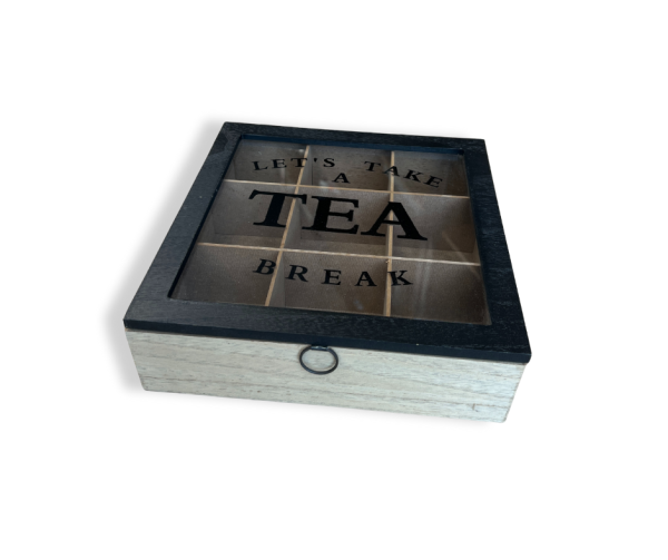 Klaasist kaanega puidust teekarp mõõtmetega 220 x 220 x 85 mm. Karbil on üheksa lahtrit mõõtmetega 65 x 65 x 50 mm, mis sobivad teepakkide hoiustamiseks. Musta värvi karbile on kirjutatud inglise keeles sõna Tea, tõlkes tee.
